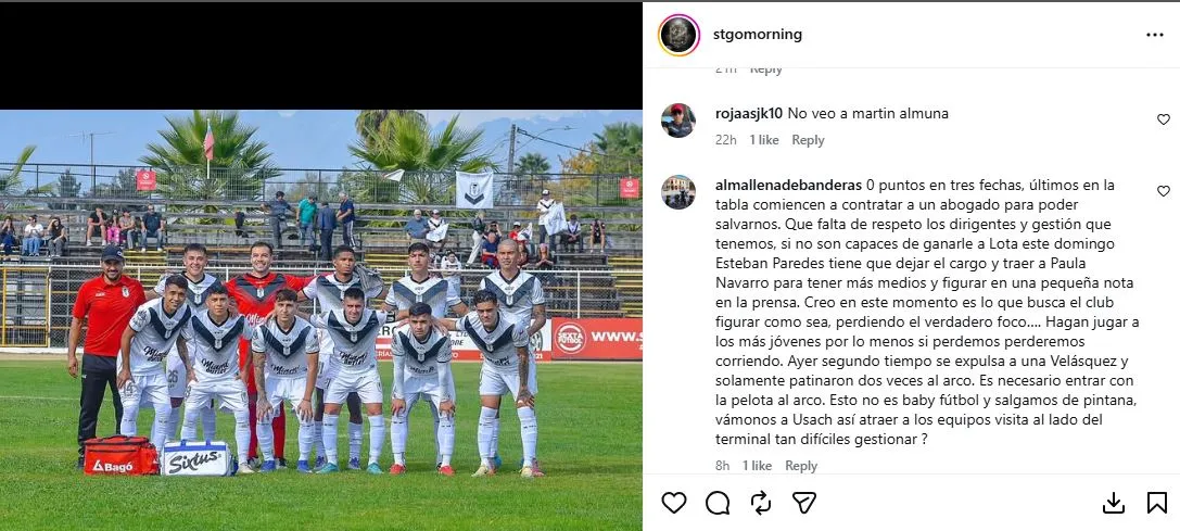 Luego de caer 3-1 ante General Velásquez, la cuenta de Instagram de Santiago Morning vio caer el descargo de los hinchas. Ahí apuntaron directamente al mandato de Esteban Paredes como entrenador en la Segunda División.
