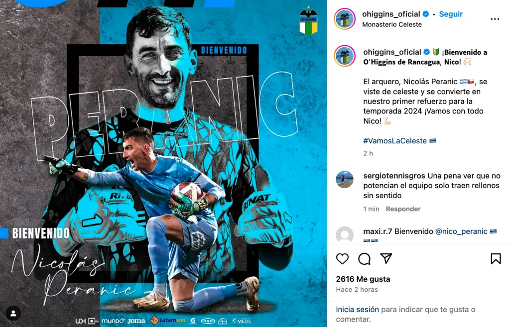 “¡Bienvenido a O’Higgins de Rancagua, Nico!. El arquero chileno-argentino Nicolás Peranic se viste de celeste y se convierte en nuestro primer refuerzo para la temporada 2024. ¡Vamos con todo Nico! #VamosLaCeleste”, comentaron en las redes sociales del elenco rancagüino para anunciar el fichaje del meta.