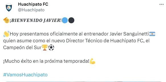 “¡Bienvenido Javier! Hoy presentamos oficialmente al entrenador Javier Sanguinetti, quien asume como el nuevo director técnico de Huachipato FC, el Campeón del Sur. ¡Mucho éxito en la próxima temporada!”, publicó el cuadro acerero en sus redes sociales.