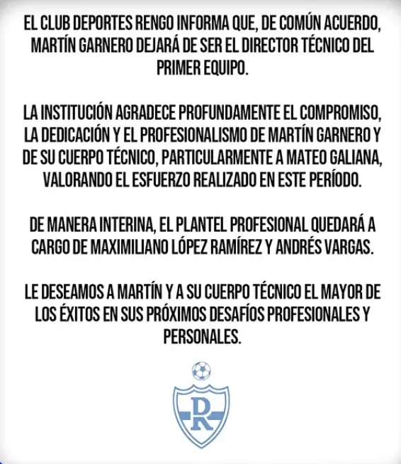“El Club Deportes Rengo informa que, de común acuerdo, Martín Garnero dejará de ser el director técnico del primer equipo”, señaló el cuadro del fútbol chileno en un comunicado.