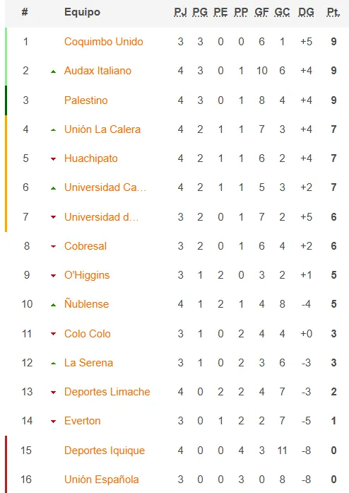 Tras los duelos Audax es segundo con 9 puntos y Palestino tercero (9), ambos superados sólo por la diferencia de goles del puntero Coquimbo Unido. Limache es 13° con sólo 2 unidades y Deportes Iquique ocupa zona de descenso (15° sin puntos).