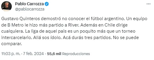 “Gustavo Quinteros demostró no conocer el fútbol argentino. Un equipo de Primera B Metrolitana (tercera categoría argentina) le hizo más partido a River”, sostuvo Carroza en su cuenta de X.
