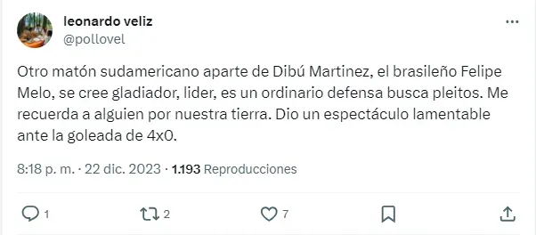 Todo arrancó con un comentario hacia el argentino Emiliano Dibu Martínez, de quien dijo que “será recordado como un idiota y no por sus atajadas. Dura critica de los ingleses al matón argentino. Razón tienen”, para luego poner en la misma balanza a Melo.