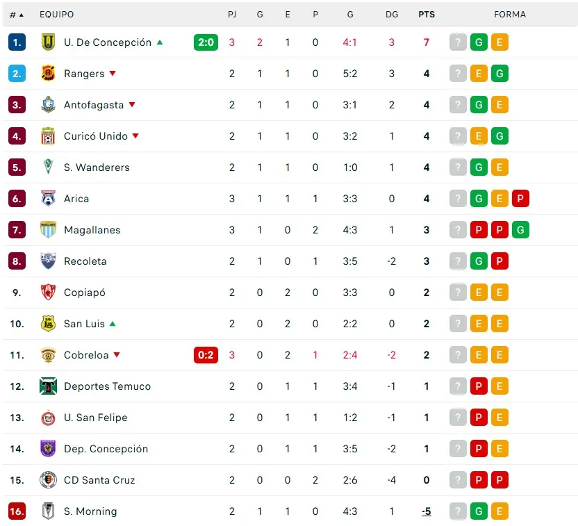 Si miramos la Tabla de Posiciones, el colista exclusivo es Santiago Morning que tiene un puntaje de -5 unidades, por lo tanto Cobreloa hoy está a siete puntos de caer en la zona roja. Mientras que el Campanil es el exclusivo líder de Primera B con siete.