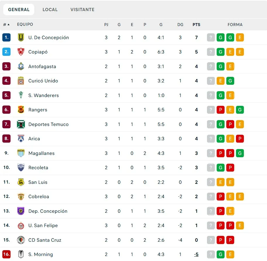 Mientras que en la parte baja de la clasificación en Primera B, San Felipe queda en la 14° ubicación con dos unidades, ya que el colista exclusivo es Santiago Morning, quien registra producto de castigos de la ANFP un puntaje de -5.