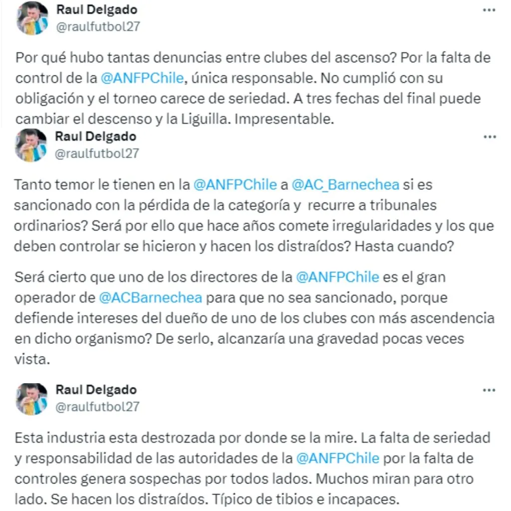 Pero lo más contundente vino después. “¿Tanto temor le tienen en la ANFP a Barnechea si es sancionado con la pérdida de la categoría y recurre a tribunales ordinarios? ¿Será por ello que hace años comete irregularidades y los que deben controlar se hicieron y hacen los distraídos? ¿Hasta cuando?”, afirma Delgado.