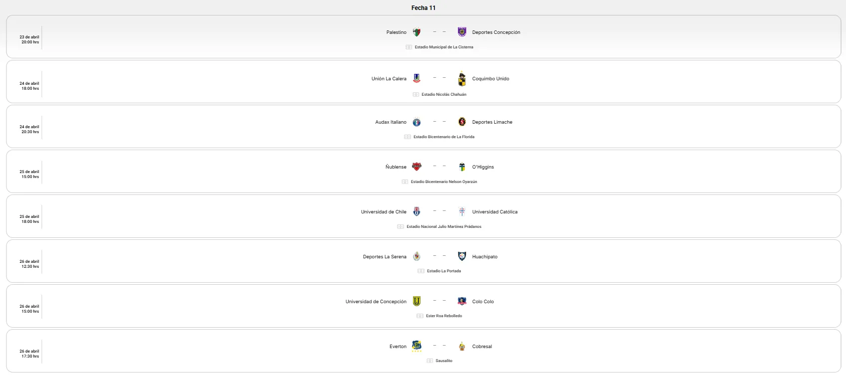 - Fechas confirmadas para los grandes clásicos: La ANFP definió que el Clásico Universitario entre la U y la UC se jugará el sábado 25 de abril a las 18:00 horas en el Estadio Nacional. Por su parte, el duelo entre Universidad Católica y Colo Colo marcará un hito al disputarse por primera vez en el Claro Arena el domingo 24 de mayo a las 18:00 horas.