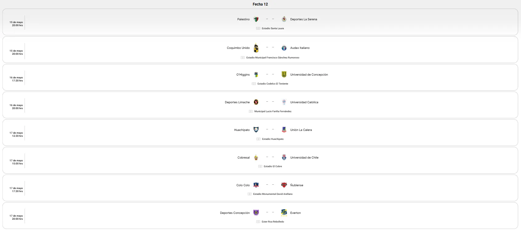 En la jornada 12 de la Liga de Primera el choque más llamativo será el que animen Deportes Limache ante la UC el 16 de mayo a partir de las 20:00 horas. Los Tomateros esperan mantenerse peleando el liderato y prometen ser una dura prueba para los de la Franja, que posteriormente tendrán otro derbi.
