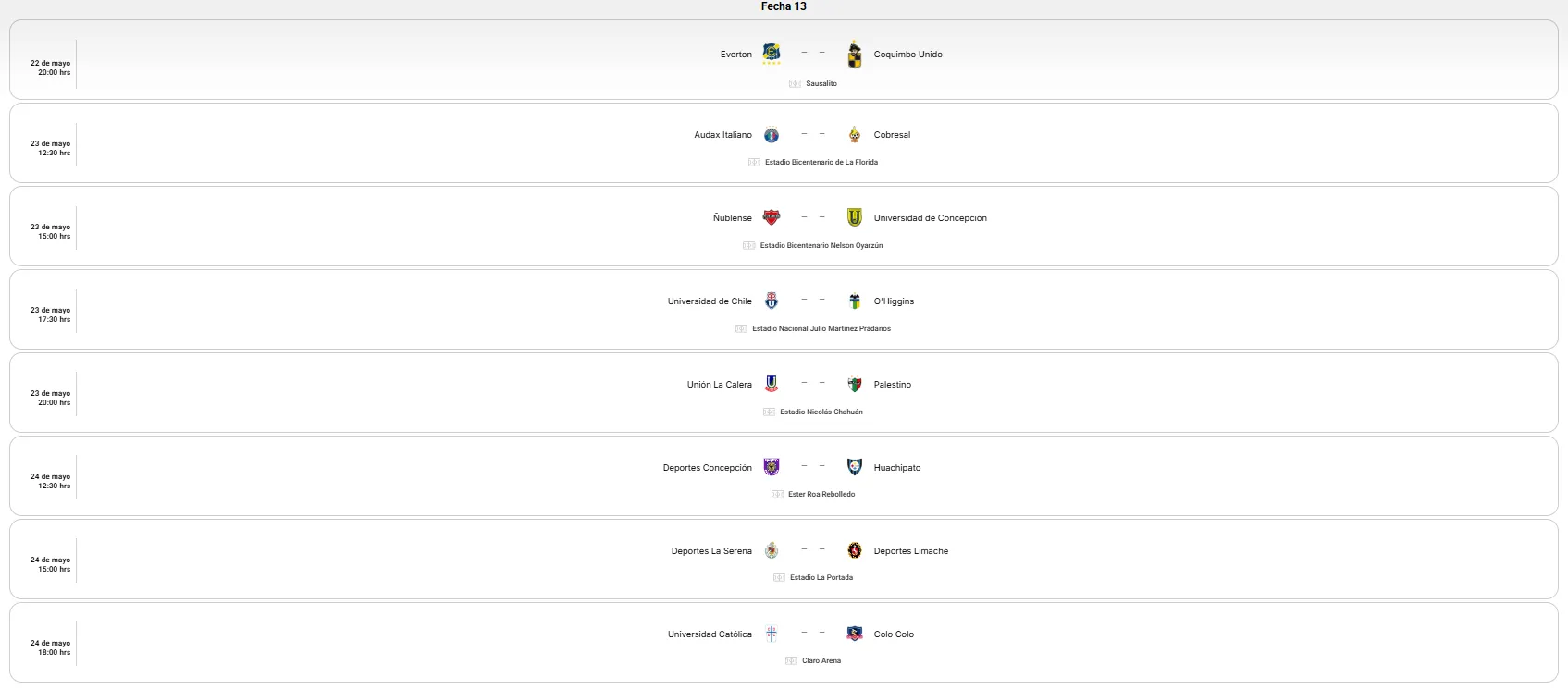 En la fecha 13 será el turno del nuevo Clásico del fútbol chileno. Universidad Católica será local y recibirá por primera vez un duelo de esta magnitud en el Claro Arena nada menos que ante Colo Colo el domingo 24 de mayo y, a diferencia de años anteriores, desde las 18:00 horas.