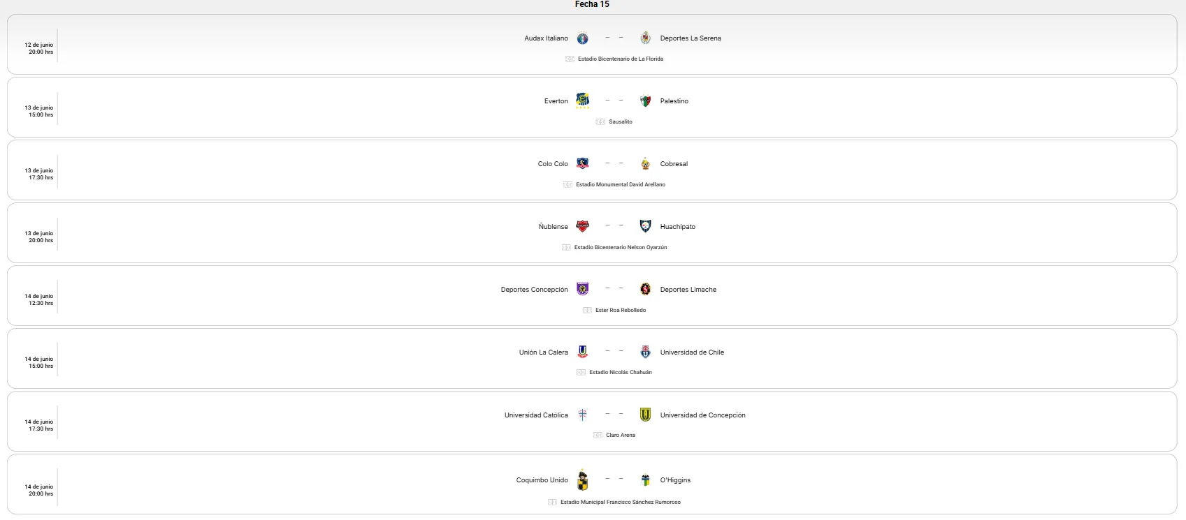 En la fecha 15, que pondrá fin a la primera rueda del torneo, los encargados de bajar el telón son dos que pelean copas: Coquimbo Unido y O’Higgins. Los Piratas recibirán al Capo de Provincia el domingo 14 de junio desde las 20:00 horas, mientras se esté disputando el Mundial de Estados Unidos, Canadá y México 2026.