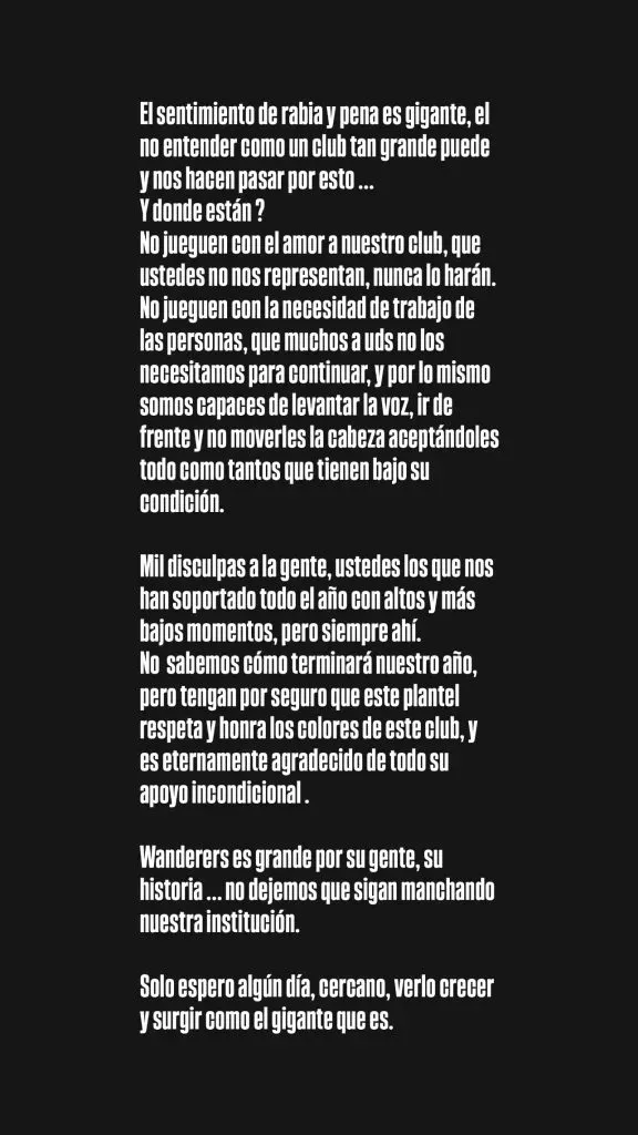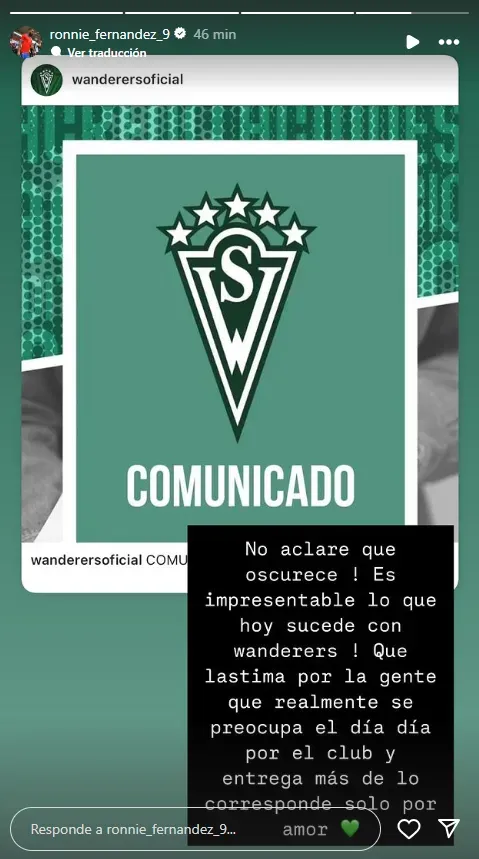 “¡Es impresentable lo que hoy sucede con Wanderers! Que lástima por la gente que realmente se preocupa día a día por el club y entrega más de lo que corresponde sólo por amor”, escribió Ronnie Fernández en Instagram.