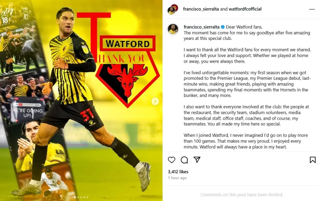 Agradeciendo además a todos los que son parte del club. “Cuando llegué al Watford, nunca imaginé que llegaría a jugar más de 100 partidos. Eso me llena de orgullo. Disfruté cada minuto. El Watford siempre tendrá un lugar en mi corazón. Siempre los recordaré, aficionados del Watford. Una vez Hornet, siempre Hornet”.