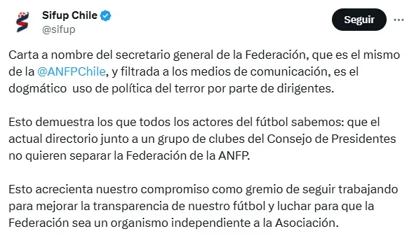 A través de la red social X (antes llamada Twitter), el sindicato disparó sin ningún filtro a la ANFP. “Carta a nombre del secretario general de la Federación, que es el mismo de la ANFP, y filtrada a los medios de comunicación, es el dogmático uso de política del terror por parte de dirigentes“, expresaron.