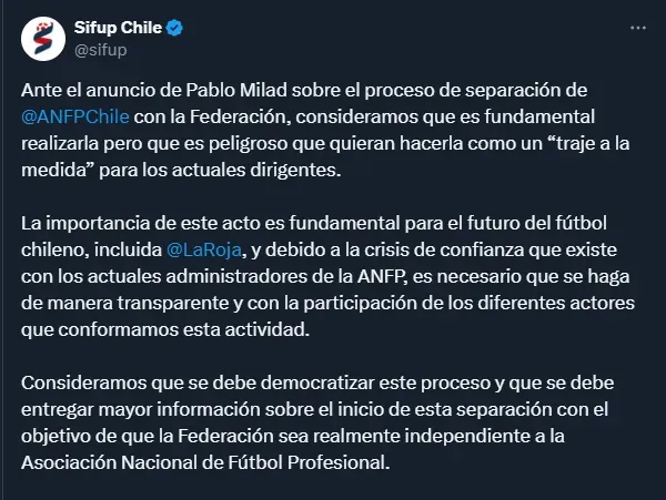 En ese mismo sentido, esperan que el proceso de separación tan esperado sea de cara a todos los actores de la actividad. “Debido a la crisis de confianza que existe con los actuales administradores de la ANFP, es necesario que se haga de manera transparente y con la participación de los diferentes actores que conformamos esta actividad”, dicen.