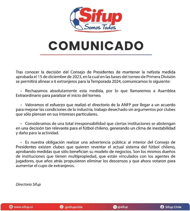 Además, la entidad comandada por Gamadiel García añadió que “consideramos de una total irresponsabilidad que ciertas instituciones se abstengan en una decisión tan relevante para el fútbol chileno, generando un clima de inestabilidad y daño para la actividad”.