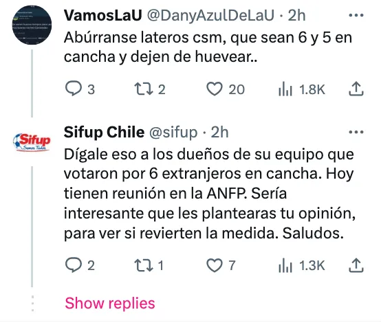 Y por si eso fuera poco, el Sindicato se ha dedicado a responderle a todos los hinchas que les piden que dejen de insistir con volver a cinco foráneos. “Dígale eso a los dueños de su equipo que votaron por 6 extranjeros en cancha. Hoy tienen reunión en la ANFP. Sería interesante que les plantearas tu opinión, para ver si revierten la medida. Saludos”, comentaron.