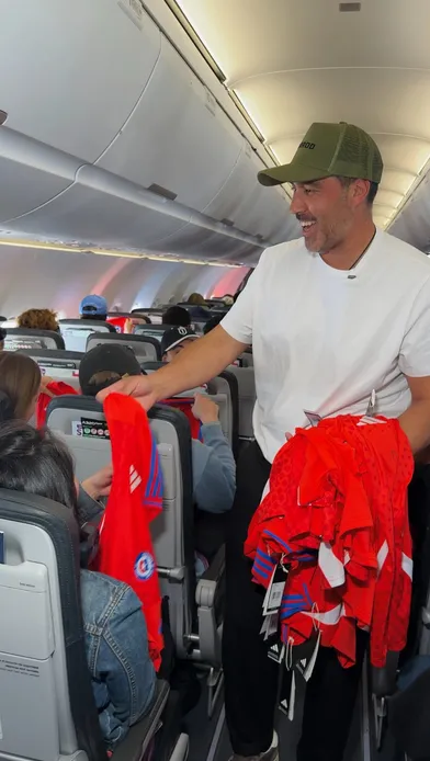 “Sigo sin creérmelo. Es una experiencia inolvidable”, dijo uno de los pasajeros que iba en el vuelo y que se encontró con la sorpresa. Él fue uno de los que recibió una de las cerca de 200 camisetas de Chile firmadas por el ex capitán de “La Roja”.