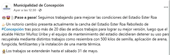 Héctor Muñoz, alcalde de la comuna de Concepción, comentó a Radio Biobio que estos trabajos iban a tener una duración de 40 días, con “labores de resiembra, mejoras, aireación y otros mecanismos para que la cancha llegue bien a fin de año”.