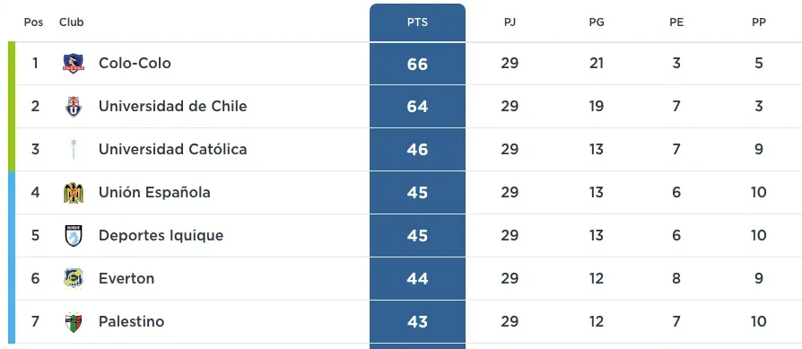 Con estos resultados, Colo Colo continúa como líder de la tabla de posiciones del Campeonato Nacional, ahora con 66 puntos. U. de Chile lo persigue con 64 unidades. El campeón se definirá en la última fecha, donde los albos tienen la primera opción. Con un triunfo frente a Deportes Copiapó, darán la vuelta. Solo un tropiezo del Cacique le da chances a la U, que enfrentará a Everton.