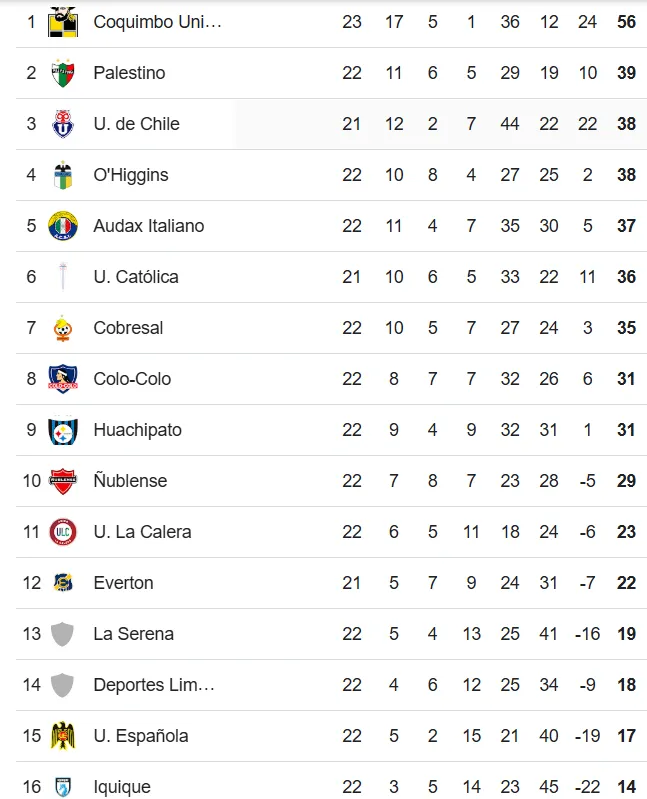 Por otro lado, está Universidad de Chile tercera con 38 unidades y con dos partidos pendientes, que de ganar los haría llegar a 44 unidades, además les falta recibir a Coquimbo.