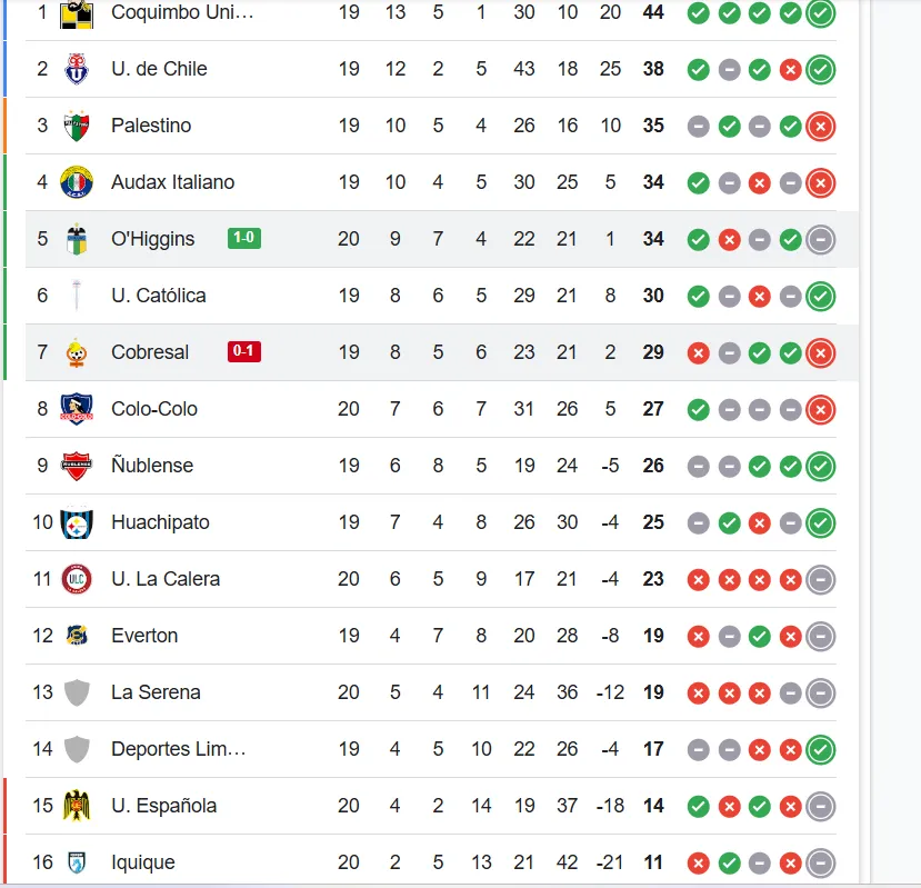 Mientras que Cobresal, que venía de vencer a la U y perder con Coquimbo Unido, es séptimo con 29 puntos, siendo, hasta hoy, el que cierra la clasificación a la Copa Sudamericana.