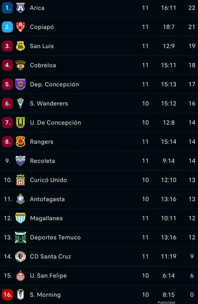 San Marcos de Arica sigue siendo el líder de la Primera B, seguido por Deportes Copiapó. San Luis, Cobreloa y Concepción se meten poco a poco en la pelea por lograr el ascenso directo a Primera.