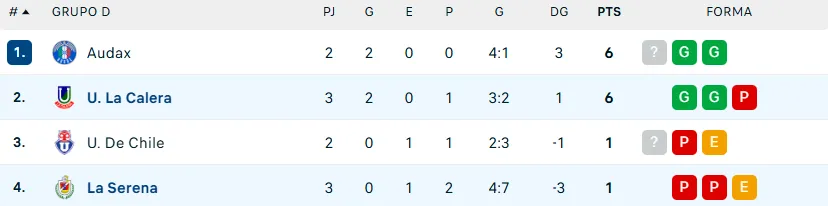 Difícil panorama para la Universidad de Chile, ya que Unión La Calera alcanza a Audax Italiano en la punta del Grupo D. Una derrota ante los itálicos dejaría a la U a ocho unidades de la cima, una distancia difícil de atrapar. Lo peor es que La Calera también empieza a alejarse.