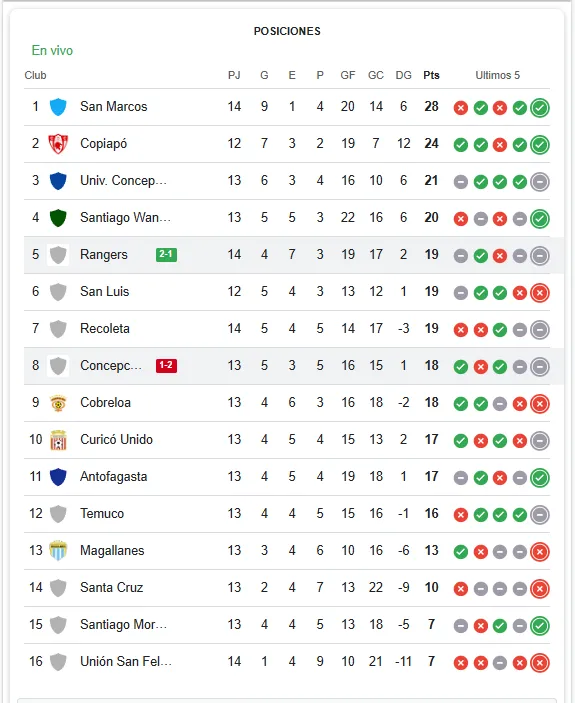 Luego de la victoria de Santiago Morning a Unión San Felipe, la victoria de Rangers ante Deportes Concepción, junto a la goleada de Antofagasta a Magallanes, así queda la tabla de posiciones de la Liga de Ascenso, o Primera B.