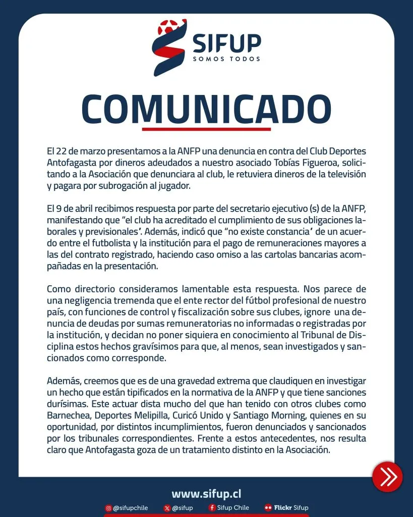 En la misiva, el Sifup reveló la respuesta del secretario ejecutivo (s) de la ANFP, acerca del caso entre el jugador y el club, el que sorprende a todos. “El club (Deportes Antofagasta) ha acreditado el cumplimiento de sus obligaciones laborales y previsionales”, dice el escrito.