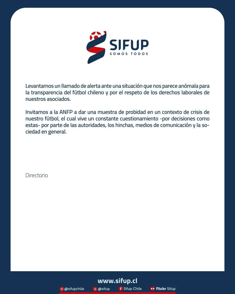 De hecho, luego lanzan un feroz misil. “Nos resulta claro que Antofagasta goza de un tratamiento distinto en la Asociación“, puntualizan. “Levantamos un llamado de alerta ante una situación que nos parece anómala para la transparencia del fútbol chileno y por el respeto de los derechos laborales de nuestros asociados“, finaliza.