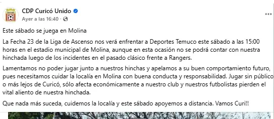 A través de una publicación en redes sociales, Curicó Unido lamentó no contar con hinchas para enfrentar al Pije en la próxima jornada.