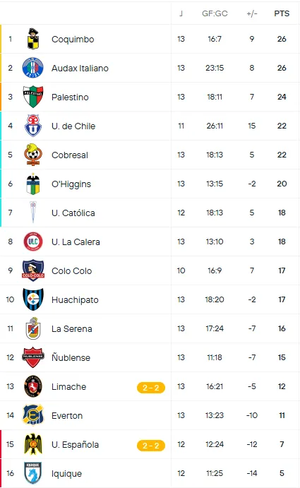 En tanto, Deportes Limache queda en la posición 13, pero con 12 unidades, y diferencia de gol de -5, sacando cinco cuerpos de distancia de los hispanos en la lucha por no descender.