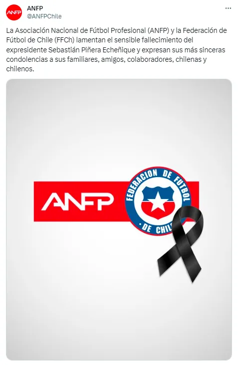 Finalmente, en representación de todo el fútbol nacional, la ANFP utilizó sus canales para manifestar que tanto ellos como la Federación de Fútbol (FFCh), “lamentan el sensible fallecimiento del expresidente Sebastián Piñera Echeñique y expresan sus más sinceras condolencias a sus familiares, amigos, colaboradores, chilenas y chilenos“.