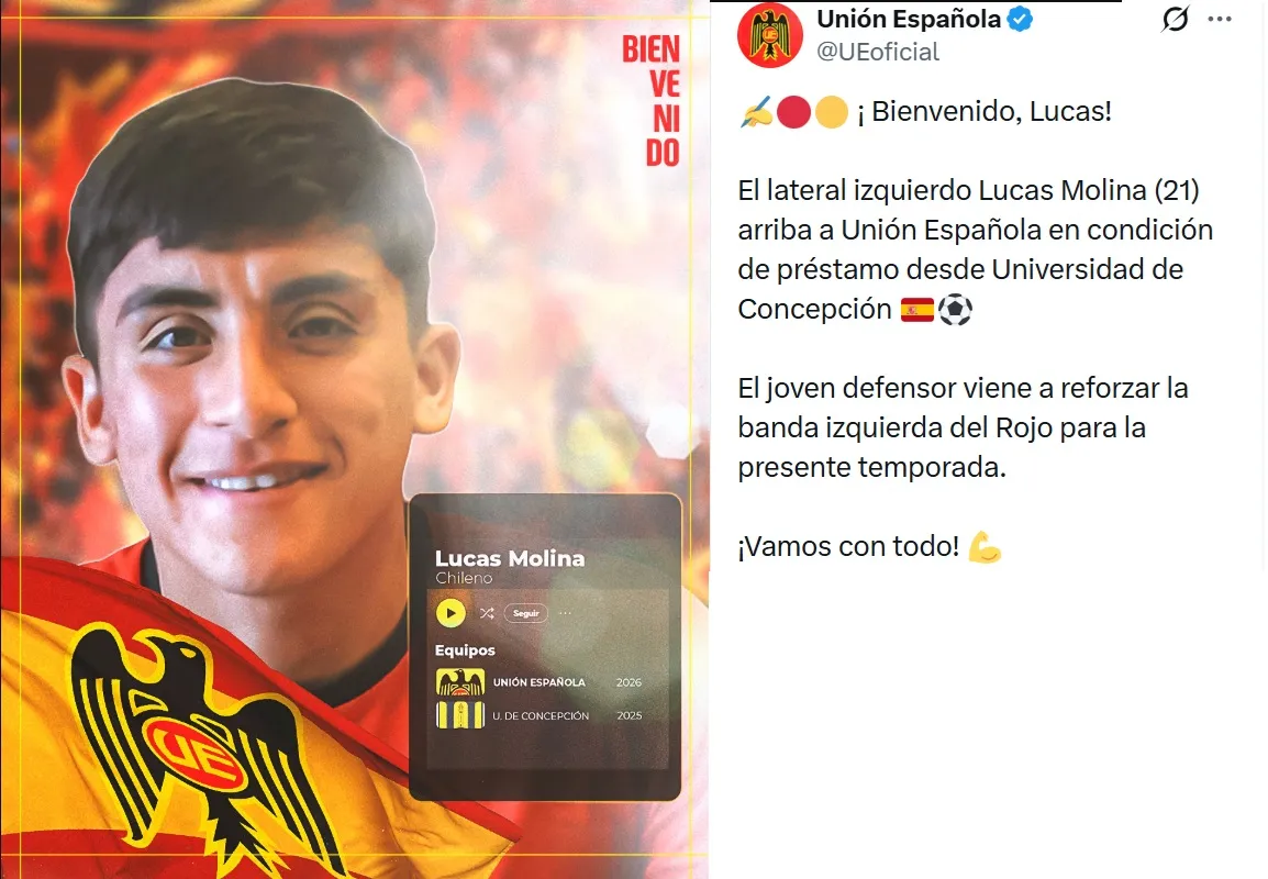 Desde Universidad de Concepción, campeón de la Primera B 2025 y que logró el ascenso, el lateral Lucas Molina se suma al cuadro hispano. “El lateral izquierdo Lucas Molina (21) arriba a Unión Española en condición de préstamo desde Universidad de Concepción”, señalaron a través de sus redes.
