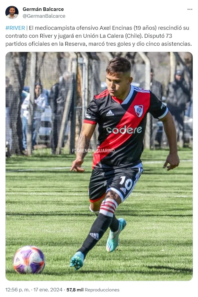 La información la dio a conocer el periodista argentino Germán Balcarce, y apunta a que Axel Encinas, de 19 años, figura del equipo Reserva de los Millonarios decidió rescindir su contrato con esta institución, y llega en calidad de agente libre a La Calera.