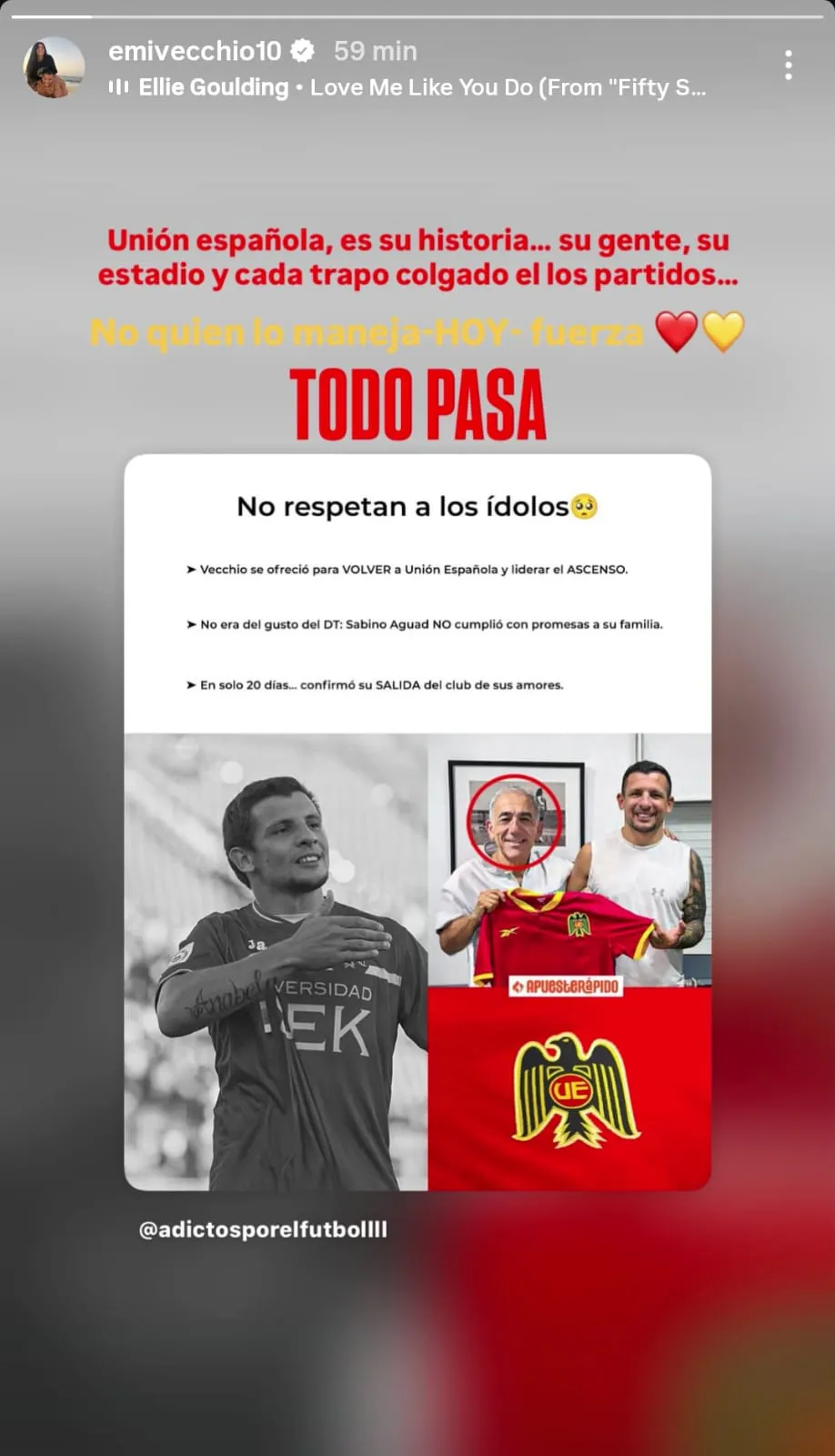 “Unión Española es su historia, su gente, su estadio y cada trapo colgado en los partidos… No quien lo maneja hoy ¡Fuerza! Todo pasa“, dijo sobre una publicación que reposteó.