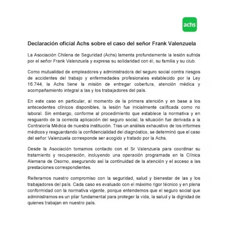 El club se mostró contento tras la decisión tomada por la ACHS en entregar la cobertura médica tras la lesión de gravedad de Frank Valenzuela.