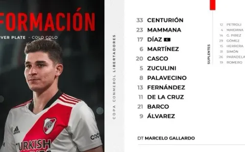 Con esto, River formará conEzequiel Centurión; Emanuel Mammana, Paulo Diaz, David Martínez, Milton Casco;Bruno Zuculini, Enzo Fernández; Nicolás De La Cruz, Agustin Palavecino, Ezequiel Barco;Julián Álvarez.