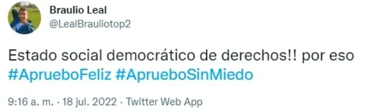 ¿Más de Leal? El ex jugador, que hoy trabaja en el fútbol jovende Magallanes, retuiteó una cita de Natalia Valdebenito, donde la comediante se manifiesta “contra las mentiras, contra el dinero que tienen para imponer esas mentiras, contra los medios que usan para mentirnos, contra todo vamos felices por el Apruebo“.