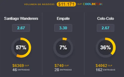 El OSO de Coolbet te cuenta que el favorito para ganar este partido del Campeonato Nacional es Santiago Wanderers y Colo Colo. Ambos pagan 2.67 veces lo que juegues, por lo que tienes posibilidades de triunfar junto al OSO. El empate, en tanto, paga 3.30 veces lo que apuestes en este encuentro.