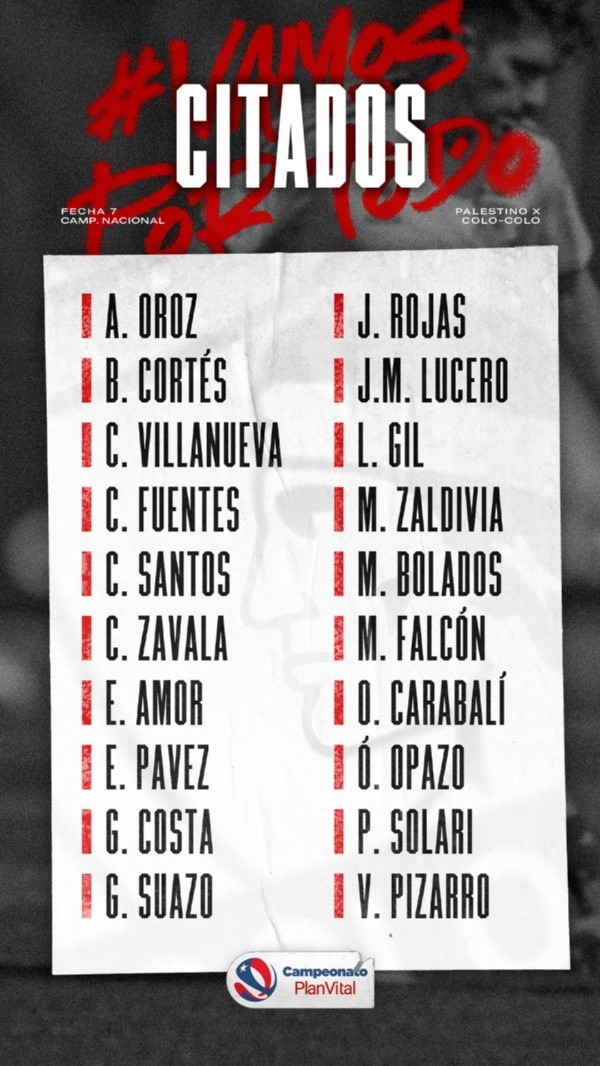 Revisa los citados de Colo Colo frente a Palestino