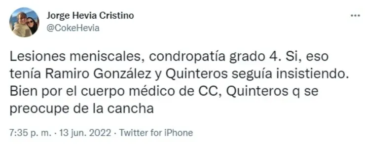A través de su cuenta de Twitter, el periodista desclasificó “lesiones meniscales y condropatía grado 4 (lesiónimportante del cartílago de la rodilla). Sí, eso tenía Ramiro González y Quinteros seguía insistiendo. Bien por el cuerpo médico de Colo Colo. Quinteros, quese preocupe de la cancha”, subrayó el comunicador.