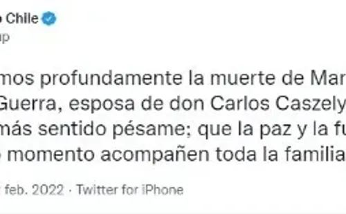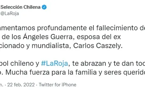 Esta mañana el hijo de Carlos y María, Piero Caszely Guerra, confirmó la triste noticia del deceso de su madre, por lo que las cuentas oficiales de La Roja, el Cacique y el Sindicato de Futbolistas profesionales no tardaron en dar sus condolencias.
