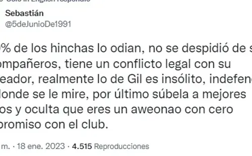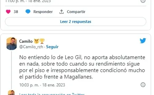 Twitter fue la principal fuente para que los usuarios albos hicieran sus descargos, quienes no le perdonaron el desatino al Colo Gil, ya que además con esto se mandó una especie de “segundo strike” por estos días tras ser expulsado infantilmente en la Supercopa 2023 ante Magallanes y quedar descartado para el debut en el Campeonato Nacional 2023.