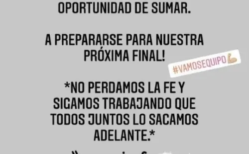 “A prepararse para nuestra próxima final, vamos equipo. No perdamos la fe y sigamos trabajando, que todos juntos lo sacamos adelante”, afirmó.