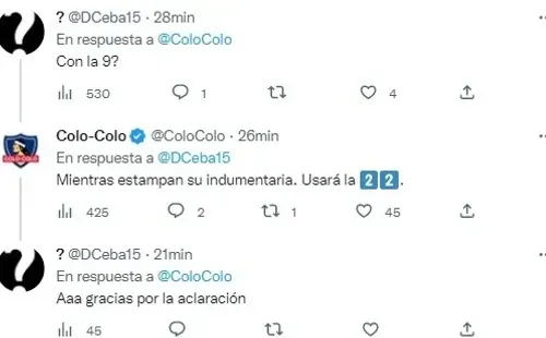 “Mientras estampan su indumentaria. Usará la 22”, respondieron en Colo Colo. Si el Gato no está, de momento será Benegas el encargado de usar su camiseta.