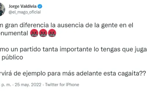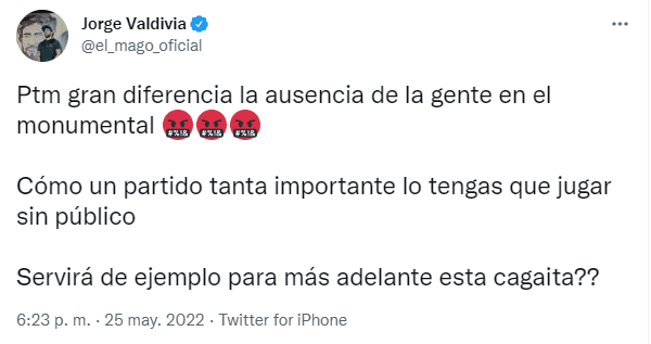 El Mago estuvo activo en la red social en todo el compromiso y se enfocó en sus críticas a los violentos por los que terminaron castigando al estadio Monumental. “Ptm gran diferencia la ausencia de la gente en el monumental Cómo un partido tanta importante lo tengas que jugar sin público Servirá de ejemplo para más adelante esta cagaita?? (dixit)”, escribió.
