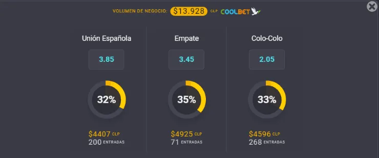 Para el OSO de Coolbet, el favorito para ganar este compromiso de la novena fecha del Campeonato Nacional 2022 es Colo Colo, que paga 2,05 veces lo que juegues, por sobre los 3,85 de Unión Española, si piensas que los hispanos vencerán esta tarde. Ahora, si crees que el partido termina en empate, el resultado paga 3,45 veces lo que apuestes.