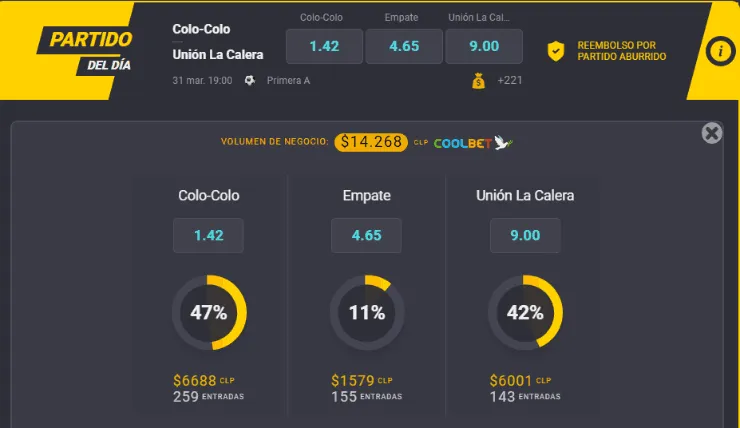 El OSO de Coolbet te cuenta que el favorito para ganar en el primer partido de la fecha 8 del Campeonato Nacional 2022 es Colo Colo, que paga 1.42 veces lo que juegues, por sobre los 9.00 que paga Unión La Calera, si piensas que los cementeros dan la sorpresa esta noche. Ahora, el empate entre ambos paga 4.65 veces lo que apuestes.