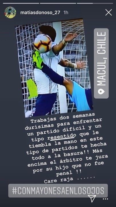 El delantero publicó en su cuenta de Instagramun duro descargo contra el árbitro del partido, Felipe González. “Trabajas dos semanas durísimas para enfrentar un partido difícil y un tipo resentido que le tiembla la mano en este tipo de partidos te tira todo a la basura. Más encima el árbitro te jura por su hija que no fue penal. Careraja. #ConMayonesaEnLosOjos”, expresó.